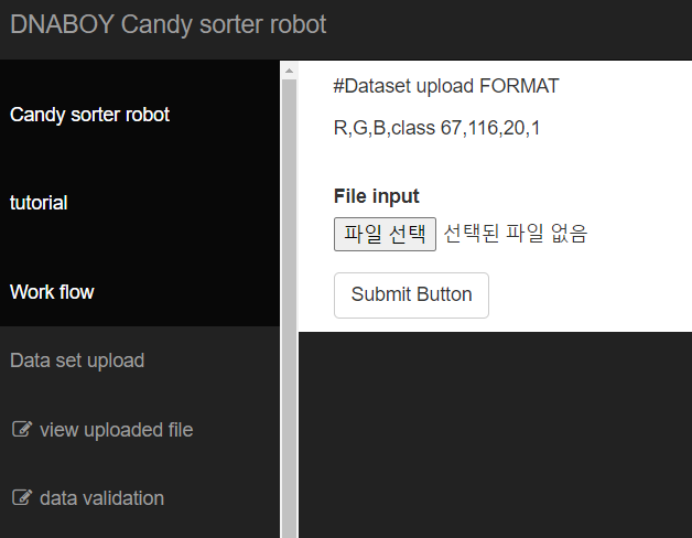 Go to candy sorter cloud server http://dnaboy.duckdns.org:9995 You can upload the candy dataset file (.csv format).