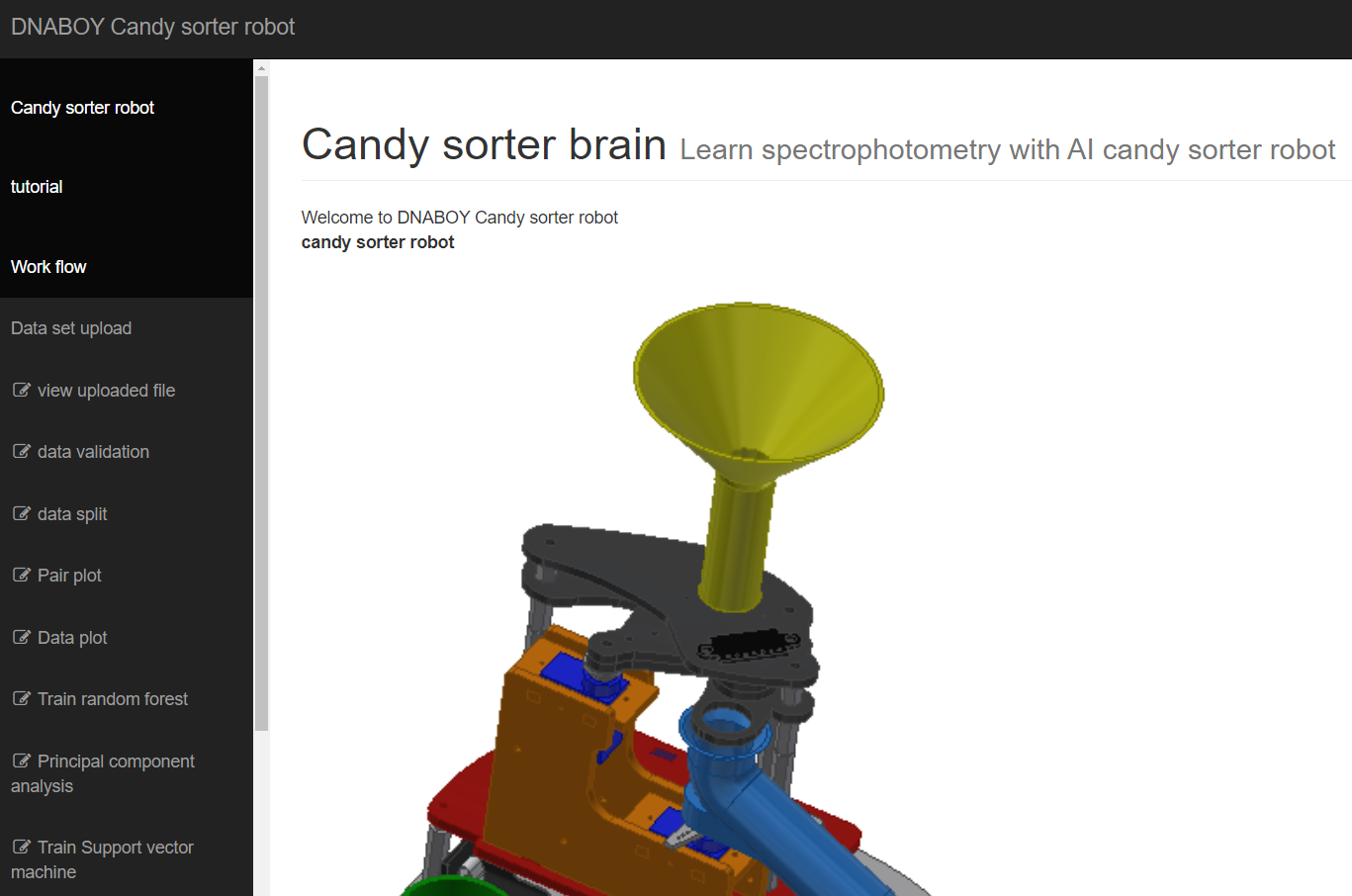Once assembled and the power switch is on, the DNABOY candy sorter seeks a WiFi channel with the SSID name DNABOY001 and the password 'qqqq1111'. The teacher needs to provide an internet-connected WiFi over the classroom to ensure that the machine can connect to the internet. When the computer module is connected to the internet, it logs onto DNABOY cloud server. Students need to log onto the server by opening a web browser and connect to the URL [http://candysortrobot.web.app](http://candysortrobot.web.app/). From there, they can access the block coding editor to run the machine and collect the required dataset for training the machine learning algorithm.